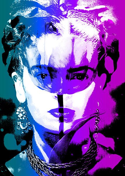 L'image montre un portrait très stylisé et intensément retravaillé de Frida, réalisé dans un style visuel très contrasté, presque semblable à une affiche. La palette de couleurs est dominée par des tons violets, bleus et turquoise, noirs et blancs, ce qui donne à l'ensemble un aspect dramatique et presque surréaliste. Les yeux et le nez…