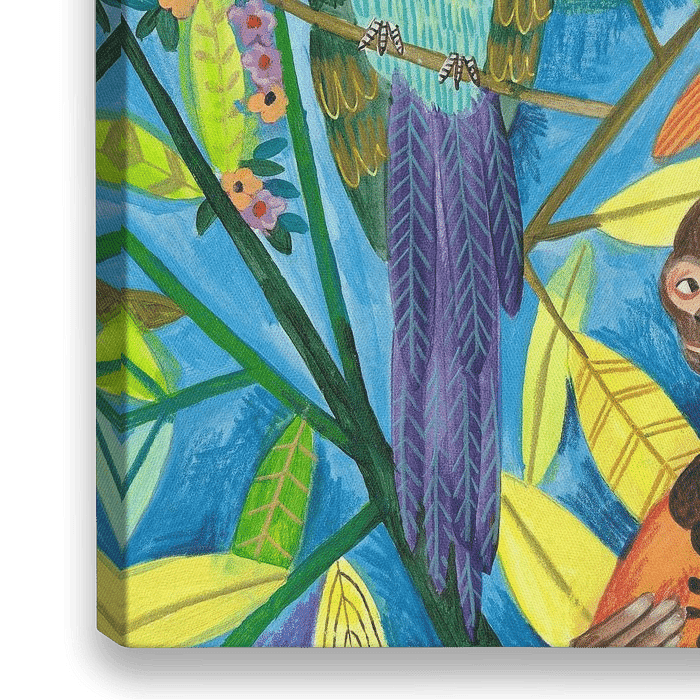 Une illustration colorée de Frida, de ses perroquets et d'un singe. Elle se tient devant sa maison bleue adorée, avec une mer de plantes et de fleurs. Peinture acrylique originale et crayon, craie et stylo sur papier