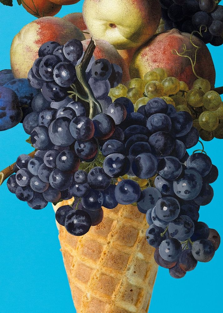 Des fruits frais d'il y a très longtemps, peints à l'époque par un vieux maître, dans un cornet de glace croustillant.