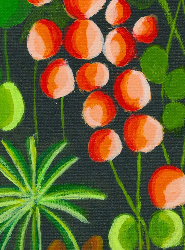 Une œuvre de fruits rouges sur fond vert donne une image vivante de l'expansion et de l'abondance. Le rouge et le vert forment une belle combinaison.