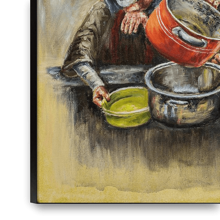 Peinture à l'huile sur toile en réponse à la situation des Gazaouis en 2025. La déshumanisation de ces personnes fait que la famine pourrait être vue tous les jours sur nos smartphones.