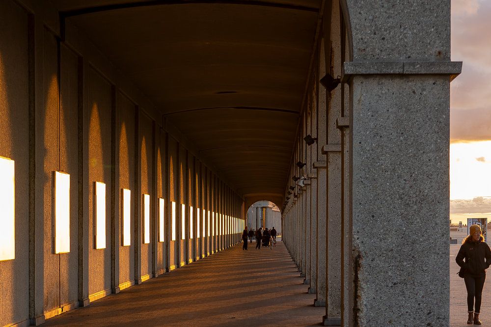 À la galerie située sur la promenade d'Ostende, il y a une belle exposition de photos en automne. Au moment où j'y suis, il y a un magnifique coucher de soleil avec un soleil doré qui se reflète aussi magnifiquement dans les panneaux de photos. Une atmosphère très chaleureuse, bien qu'il fasse assez froid.