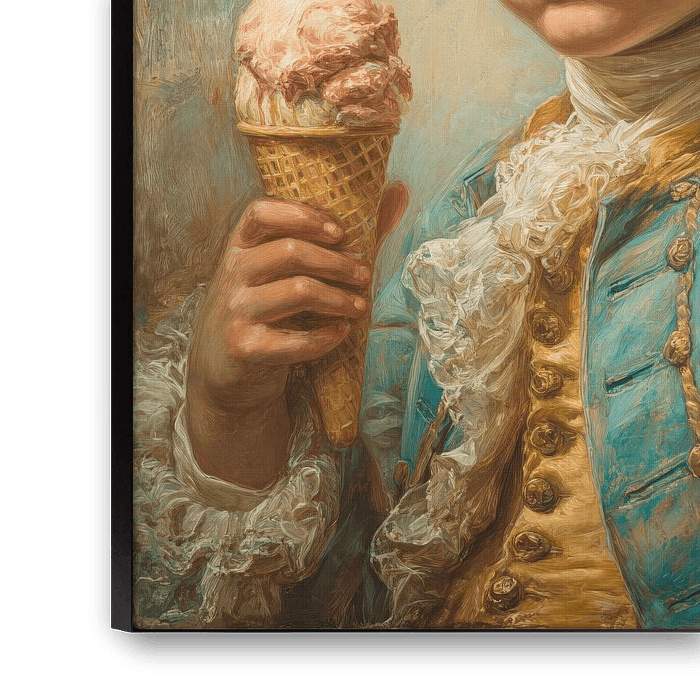 Une œuvre d'art humoristique dans laquelle un garçon baroque en costume riche tient nonchalamment une glace tout en portant audacieusement des lunettes de soleil bleu vif, créant ainsi une atmosphère joyeuse et ludique. La combinaison d'une lumière de maître ancienne, d'une technique de peinture sophistiquée et d'accessoires modernes crée un contraste charmant qui suscite immédiatement un sourire. Cette pièce s'intègre parfaitement dans les intérieurs vintage, modernes chics et éclectiques et constitue une attraction originale pour le salon, le couloir, la chambre d'enfant ou la cuisine.