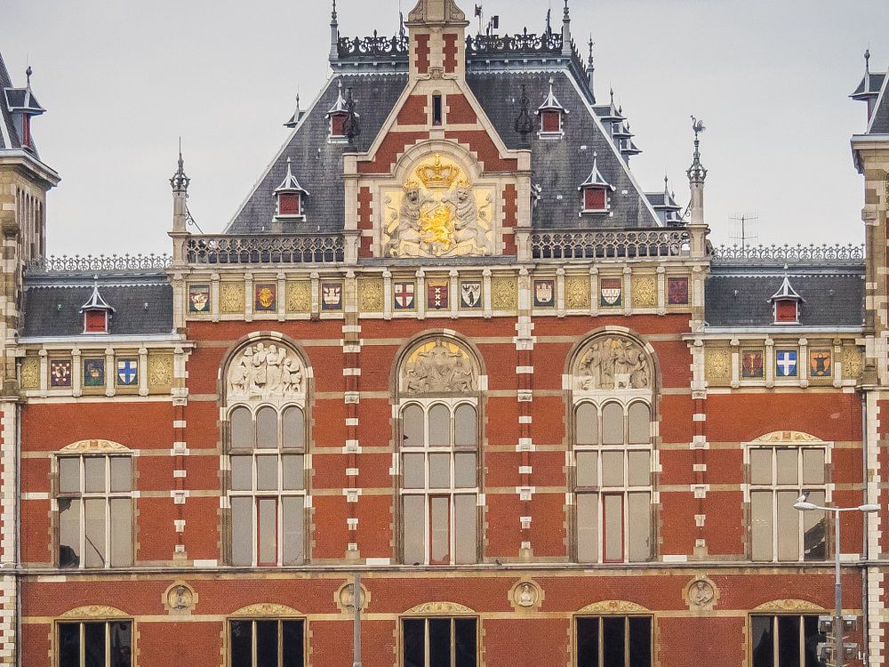 bâtiment impressionnant où les trains vont et viennent, gare centrale d'Amsterdam.