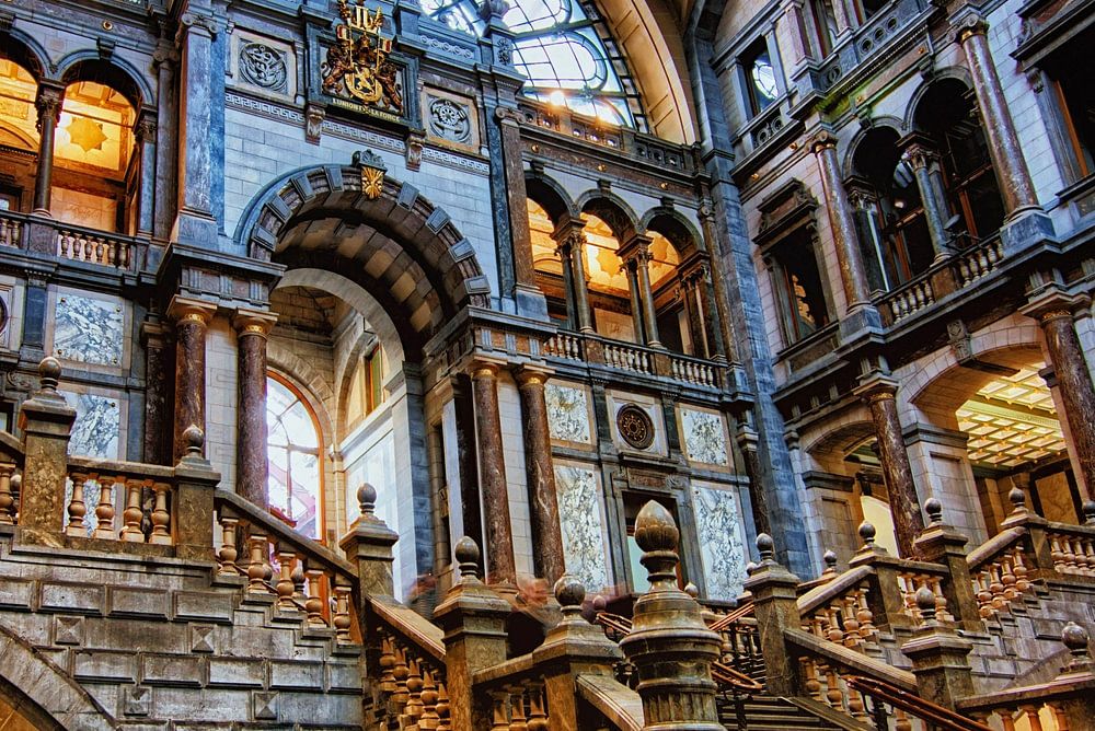 Cette vue du hall d'entrée avec son imposant escalier permet de se rendre compte de la taille et de l'étendue de la gare d'Anvers. On peut voir les différents niveaux, ainsi que les passages sous et au-dessus de l'escalier. La gare d'Anvers est l'une des plus belles gares du monde. Construite en 1895, puis restaurée et agrandie, elle est aujourd'hui un mélange d'ancien et de nouveau et compte 14 quais sur trois niveaux. L'immense hall d'entrée a été revêtu de différents types de pierre et de marbre. Lorsque l'on se tient à l'intérieur, on se sent directement transporté dans une autre époque et on pourrait presque croire que l'on se trouve dans un château fort ou un palais, tant cette gare est belle ! C'est justement la composition des différents éléments tels que les arcs, les piliers, les balustrades et les différents matériaux de construction et ornements qui rendent cette gare si particulière et en font l'une des principales attractions de la ville ! Ce n'est pas pour rien qu'on l'appelle communément la "cathédrale ferroviaire". L'image existe aussi en noir et blanc. Termes associés : Anvers, ville, gare, salle d'attente, hall d'entrée, train, voyage, baroque, château, nostalgie, rétro, marbre, escalier, cathédrale, Centraal, pierre, architecture, Belgique.