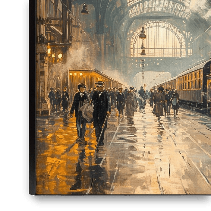 Peinture d'un train à vapeur dans la gare du Nord de Paris (1846) réalisée dans le style des impressionnistes français.