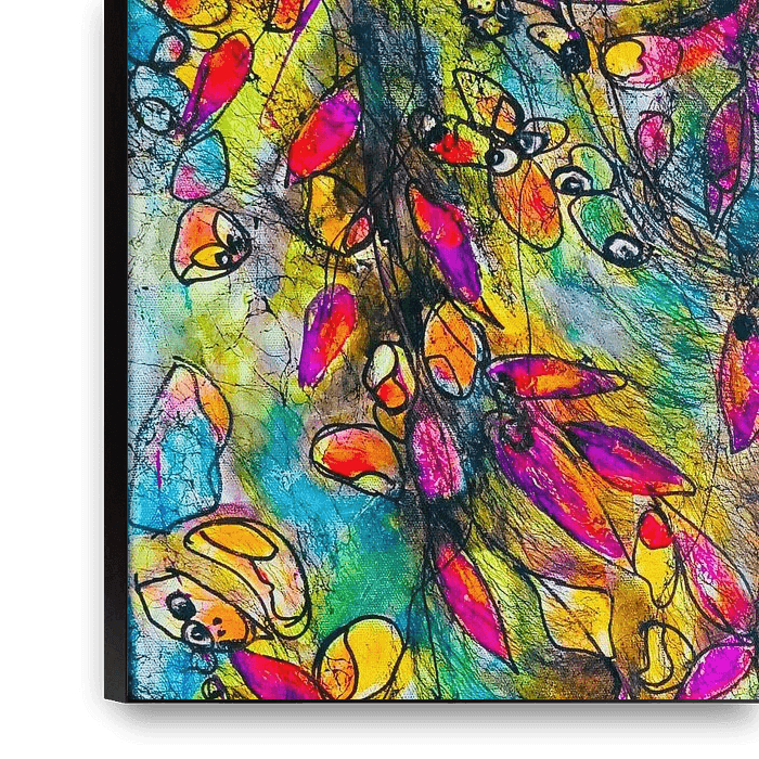 Gaze of the Hidden Ones I fait partie de la série abstraite Abyssal Chromatics, dans laquelle la couleur, la structure et la lumière se fondent en un espace narratif ouvert et complexe. Des champs de couleurs vives et puissantes, des motifs rythmiques et des textures denses déploient un jeu dynamique d'ombre et de lumière qui crée de la profondeur et maintient le regard en mouvement.