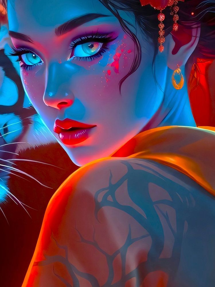 À côté du tigre se trouve une gracieuse geisha en kimono, ornée d'un tatouage en forme d'arbre - symbole de croissance et de lien avec la nature,