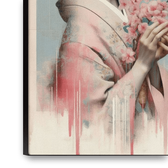 Portrait moderne et vintage d'une Geisha, avec des fleurs roses.