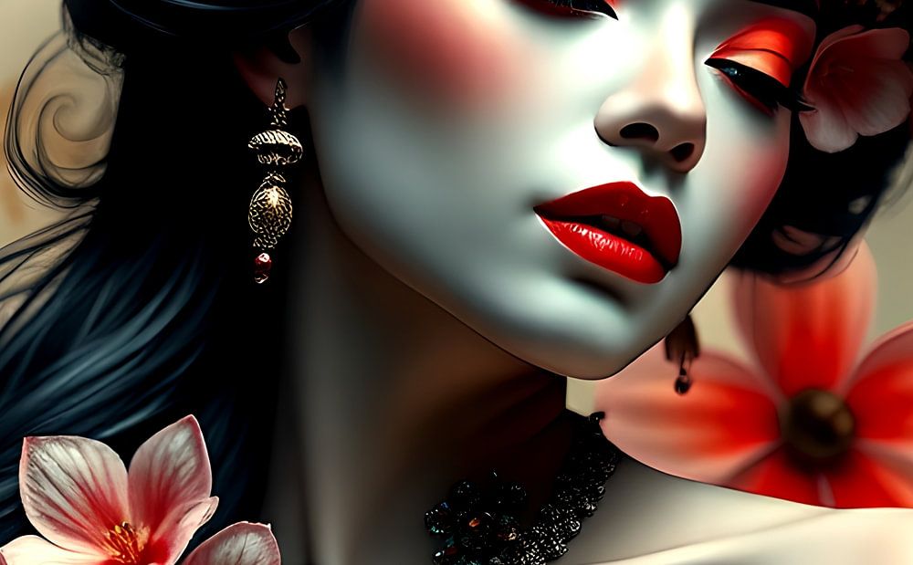 Photo pittoresque d'une geisha orientale sensuelle et fictive avec des fleurs. Détails fins et couleurs vives.