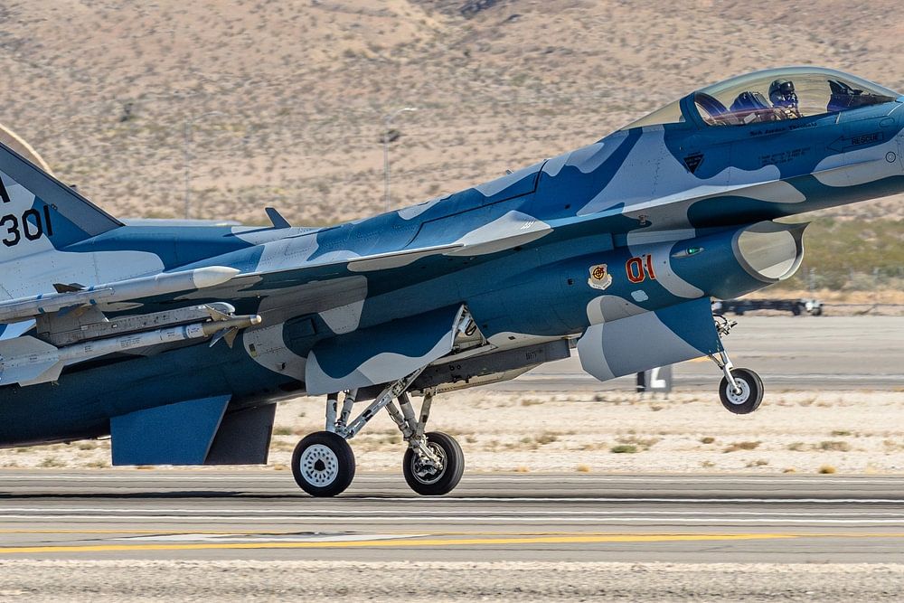 Sur la photo, un F-16C (immatriculation 84-1301) du 64e escadron d'agresseurs (64 AGRS) basé sur la base aérienne de Nellis.