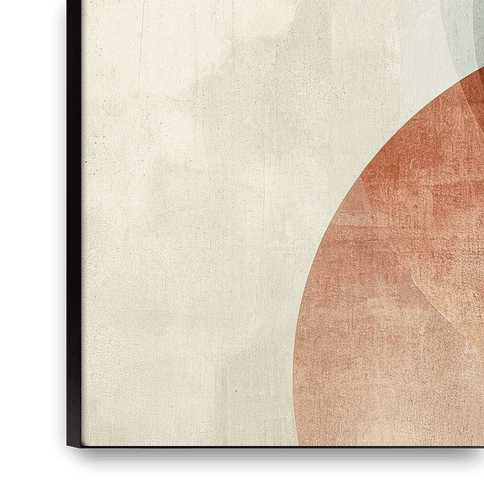 Géométrie abstraite - Cercles - D'un équilibre saisissant, cette création abstraite célèbre la géométrie avec des cercles et des carrés qui se chevauchent dans une palette discrète. Vous verrez des tons de terre doux qui exsudent l'élégance, tandis que la texture vieillie ajoute un caractère habité, convenant à la fois aux espaces modernes et classiques.