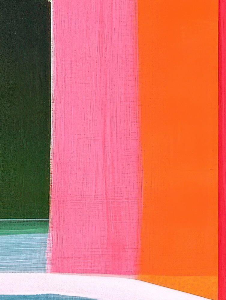 Un paysage abstrait ludique et coloré qui rappelle une journée ensoleillée au bord de la piscine avec vue sur des collines ondulantes. Les bandes verticales de couleur rose, orange et vert lime contrastent vivement avec le bleu froid de l'eau au premier plan. Cette composition moderne respire l'optimisme et la légèreté estivale et attire tous les regards dans n'importe quel intérieur.