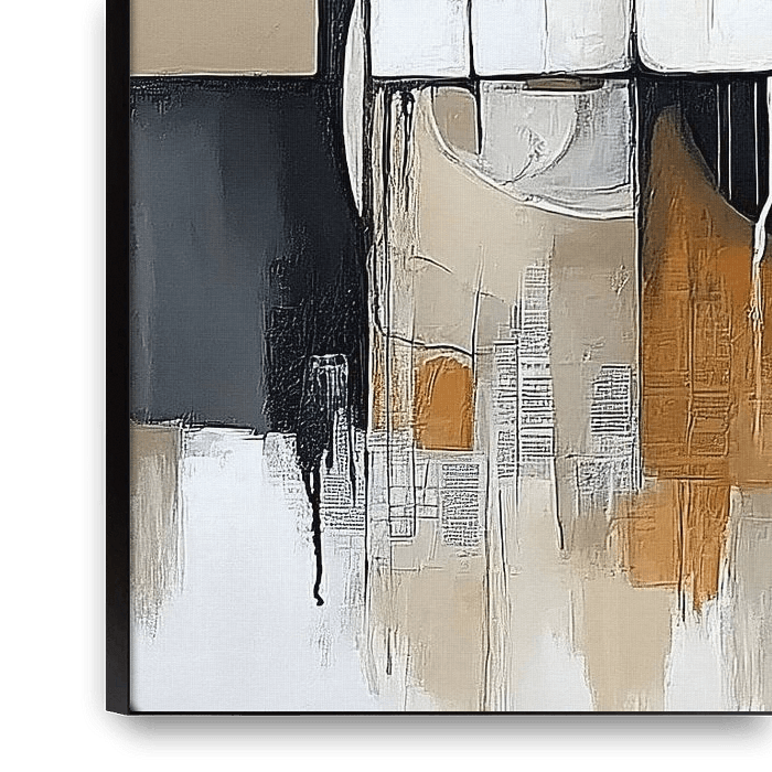 Géométrie - Cette peinture abstraite présente une composition de formes géométriques et de plans qui se chevauchent, décorée de motifs de coupures de journaux et d'une palette de couleurs beige, blanche, noire et d'accents orange proéminents.