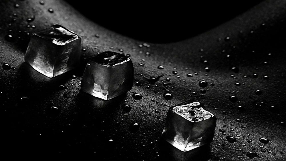 Cette intrigante photographie en noir et blanc capture trois glaçons fondant lentement sur une peau nue, avec des gouttes d'eau scintillant à la surface. Le jeu des contrastes rend cette image particulièrement puissante : la dureté froide de la glace contre les courbes douces de la peau, et la lumière vive des gouttes contre l'arrière-plan sombre. Cette œuvre d'art oscille parfaitement entre sensualité et abstraction. Elle suscite la curiosité, tout en racontant une histoire de tension entre la chaleur et le froid, le dur et le doux, le tendu et le fluide.