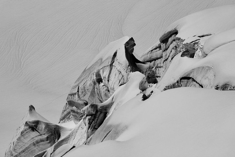 Même si ces crevasses brillent d'un bleu glacé, j'ai choisi de reproduire cette photo en noir et blanc. Cela permet de mieux mettre en valeur les structures du glacier.