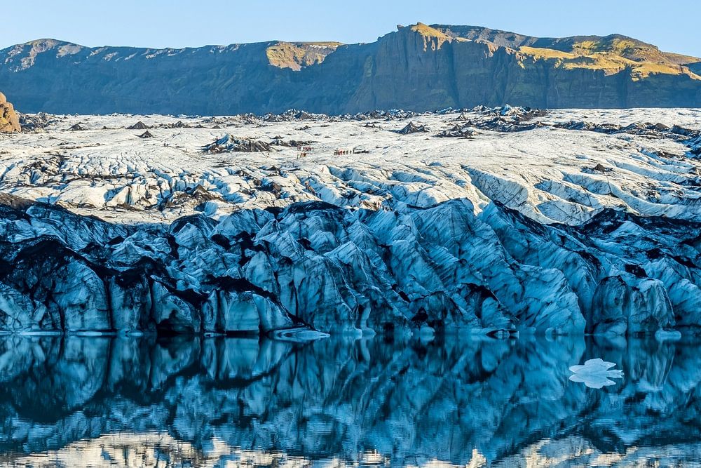 Cette photo montre le majestueux glacier Solheimajokull en Islande se reflétant dans un magnifique lac. Le glacier domine le paysage et s'étend sur toute la largeur de la photo. Sa masse imposante se reflète dans l'eau du lac, créant une double image de sa taille incroyable. Sa masse imposante se reflète dans l'eau du lac, créant une double image de sa taille incroyable. Près du bord du glacier, on peut apercevoir des silhouettes humaines presque invisibles. Ces personnes font une excursion sur le glacier pour admirer des crevasses et des vues impressionnantes. La taille du glacier par rapport aux randonneurs donne une idée claire de l'ampleur de cette force naturelle. Les couleurs de la photo sont spectaculaires et donnent à l'image un aspect presque surréaliste. Le blanc et le noir du glacier contrastent magnifiquement avec les couleurs sombres des rochers environnants et les tons profonds de l'eau. La photo dégage un sentiment de calme et de sérénité, mais on se sent également très humble au pied de ce glacier.