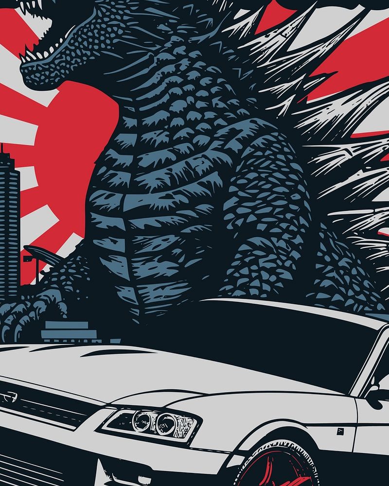 Ilustrasi epik Godzilla dengan Nissan Skyline di depan latar kota Jepang