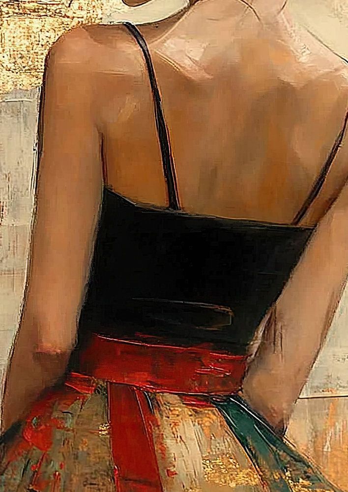 Gold Fashion | Elegant Gold Dress - Ce portrait de femme représente une élégante jeune femme vue de dos, à la peau subtilement bronzée, coiffée d'un chignon, vêtue d'une robe multicolore aux accents dorés sur un fond neutre.