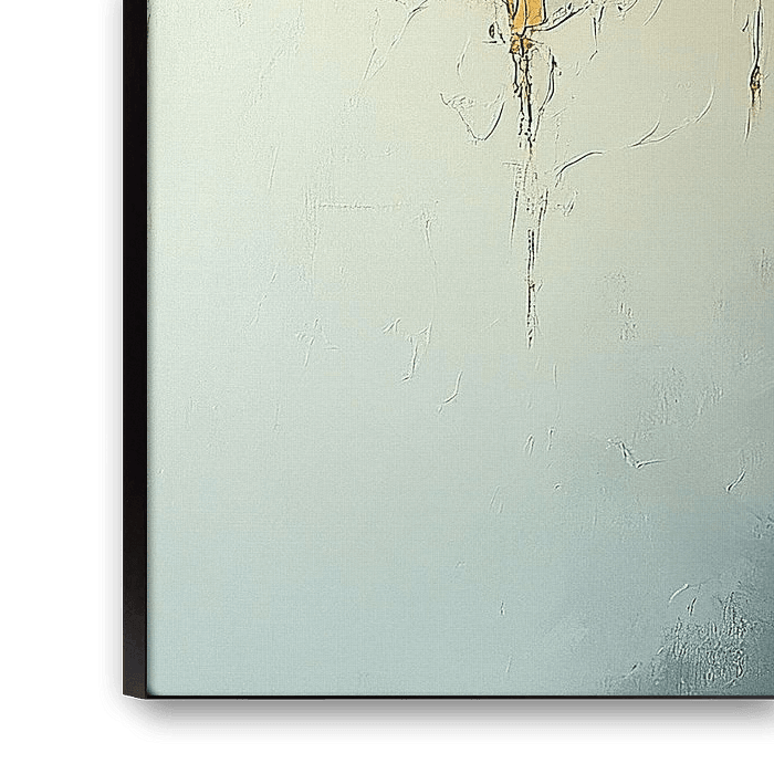 Golden Art | Golden Suspension - Cette peinture abstraite représente trois formes rectangulaires à la texture dorée qui semblent flotter au-dessus d'un fond divisé de gris immaculé et d'un sommet orange chaud et diffus.