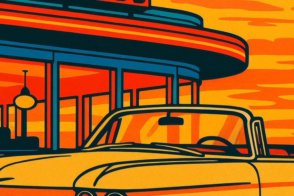 Mots-clés : Diner, cabriolet, voiture ancienne, vintage, Amérique, road trip, coucher de soleil, pop art, nostalgie, Route 66, restaurant, voiture, rétro, années 50, illustration, ciel, orange, jaune, classique, autoroute, muscle car, crépuscule, graphisme, peinture murale, americana