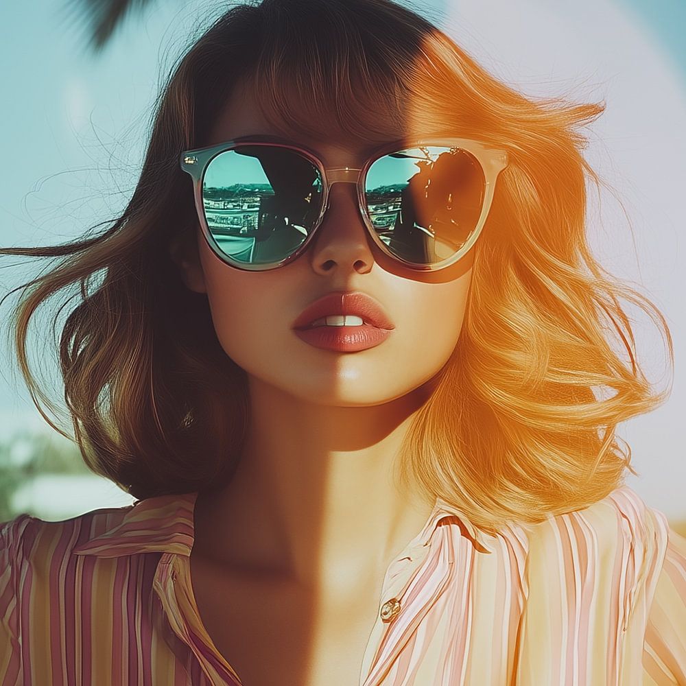 Laissez-vous séduire par l'ambiance estivale ultime avec Golden Hour Reflections (Réflexions sur l'heure d'or). Cette œuvre d'art capture l'essence d'un road trip sulfureux : une femme élégante portant des lunettes de soleil rétro, baignée dans la lumière chaude du soleil couchant. Le reflet de ses lunettes révèle des palmiers et un horizon sans fin, évoquant un sentiment de liberté et d'aventure. Parfait pour les amoureux de l'esthétique vintage, des vibrations californiennes et de la photographie avec une touche cinématographique.