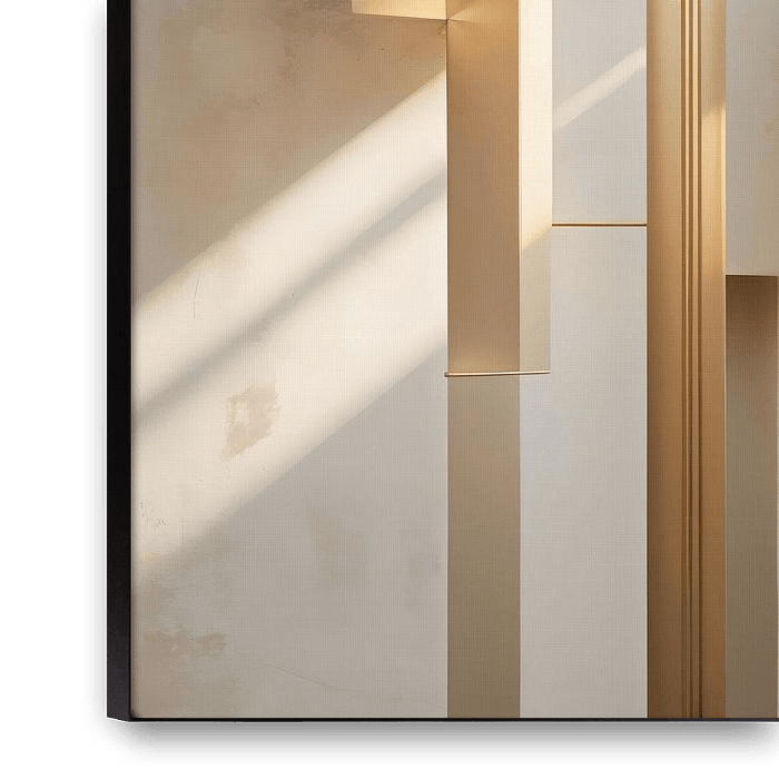 Des bandes verticales dorées, crème et ivoire pâle forment un rythme architectural qui marque le centre. Ici, la lumière n'est pas dispersée, mais centrée. Un axe silencieux traverse la composition et ancre l'ensemble dans la précision et le calme. L'œuvre respire un sentiment d'ordre conscient, comme si tout était exactement à sa place.