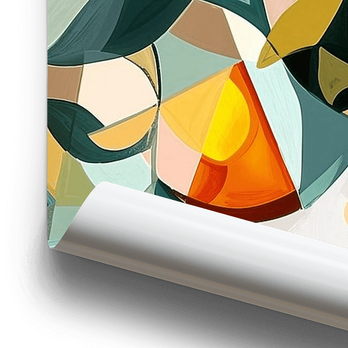 Golden Touch Nature Dance - Cette peinture abstraite présente une composition vibrante de feuilles et de fruits stylisés, dans une perspective moderne, presque surréaliste. Les formes sont arrondies et se chevauchent de manière ludique, créant un sentiment de profondeur et de mouvement. L'arrière-plan du tableau est peint dans des tons pastel doux et apaisants, allant du bleu pâle au blanc crème et à la pêche douce. Sur ce fond calme, les éléments de premier plan de la flore se distinguent par leur palette de couleurs riche et variée. Les feuilles sont rendues dans des tons de vert profond, de vert olive, de vert menthe et même de jaune sourd. Des touches d'or ajoutent des détails luxueux là où elles semblent capter la lumière. Les fruits, dont les teintes vont de l'orange au jaune en passant par le rose tendre, ajoutent à l'énergie vibrante mais subtile de l'œuvre. L'utilisation de lignes nettes et douces ainsi que les contrastes de couleurs font de cette 'peinture abstraite de la nature' ; une expérience visuellement captivante qui apporte à la fois richesse et tranquillité.