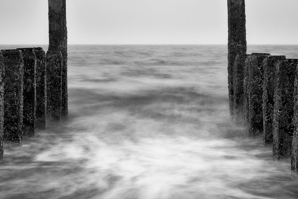 Golbrekers aan de nederlandse kust, nabij Renesse. Zwart-wit compositie, gemaakt met lange sluitertijd.
