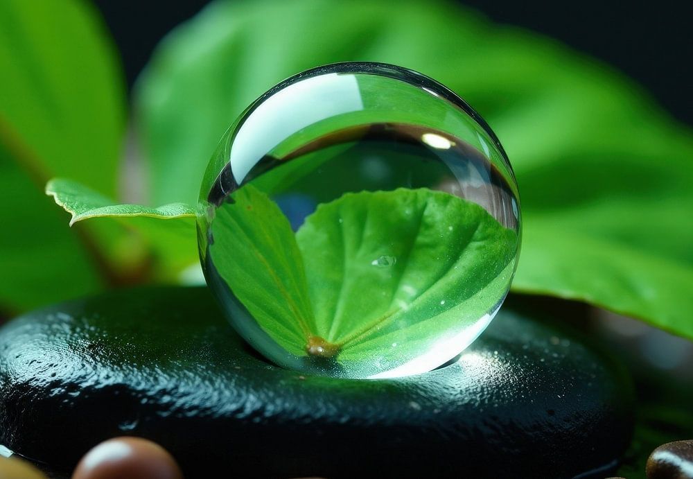 Gros plan d'une sphère transparente reposant sur une pierre gris foncé, partiellement masquée par des feuilles d'un vert éclatant. La scène se déroule au milieu d'un lit de pierres plus petites et multicolores.