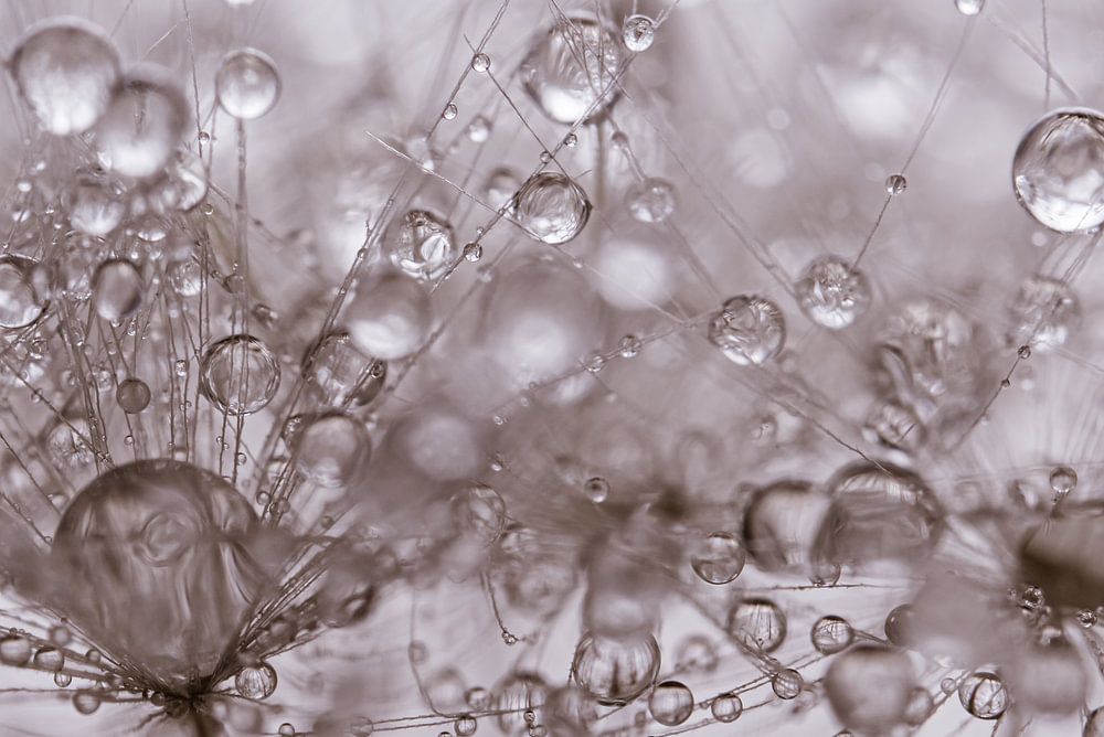 Les gouttes contribuent également à créer cette atmosphère de rêve ; elles réfléchissent la lumière et créent ainsi des scintillements entre les peluches du pissenlit.