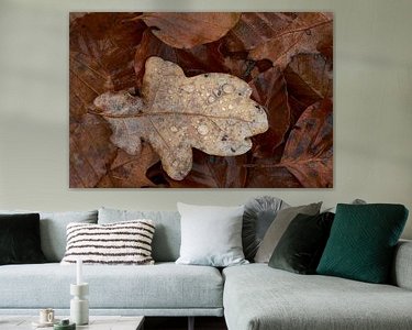 Un matin d'automne, après une nuit pluvieuse, j'ai pu prendre cette photo. Gouttes sur une feuille de chêne entre les feuilles de hêtre. La structure des feuilles, la couleur naturelle brun chaud et le contraste entre les feuilles de chêne et les feuilles de hêtre donnent à l'ensemble un aspect agréable.