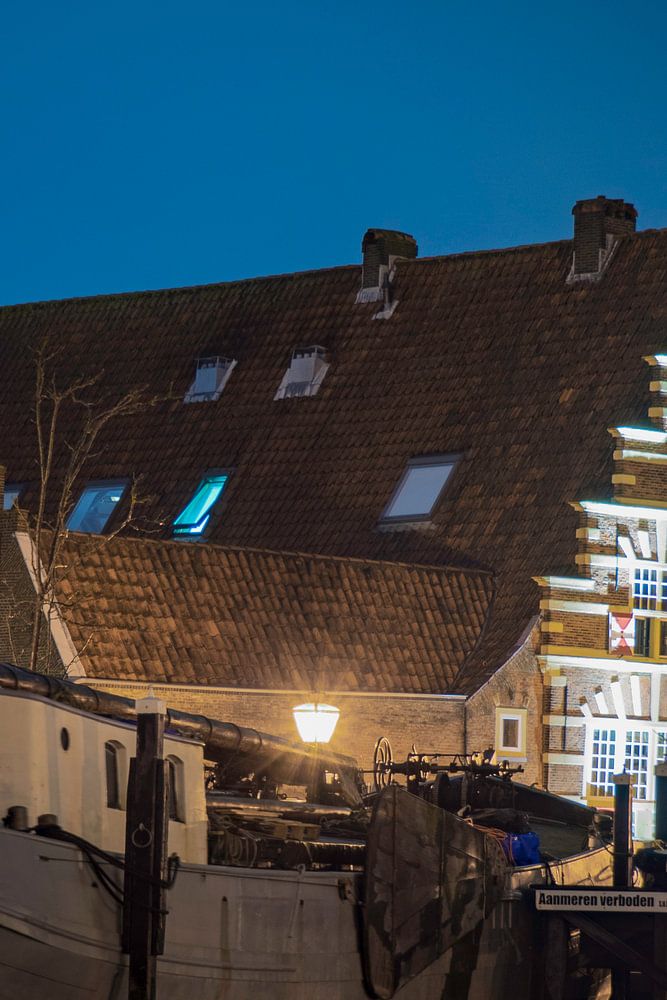 Foto van een gracht in Leiden. Deze foto is in de nacht gemaakt met een zogenaamde 'long exposure'. Dit geeft een dromerig effect.