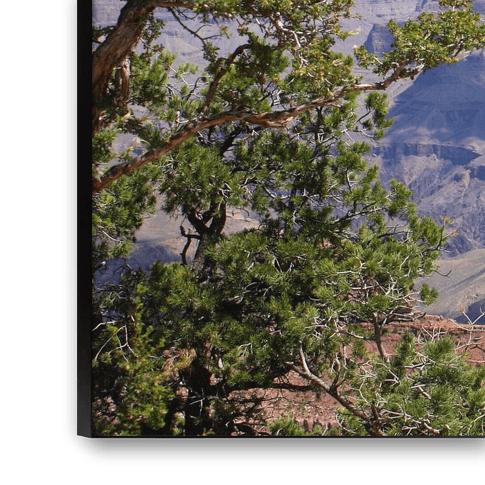 Pendant mes vacances en Amérique, j'ai pris cette photo du Grand Canyon. Entre 2 arbres, une belle vue sur l'immense canyon. Le Grand Canyon est situé dans l'État de l'Arizona. Elle est traversée par le fleuve Colorado.