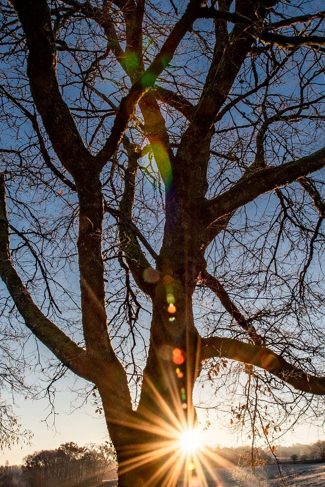 Grand arbre isolé (chêne) au lever du soleil en hiver. Le soleil passe juste derrière le bord de l'arbre, ce qui donne un effet d'étoile. Le paysage vallonné de la Dordogne en France complète l'ensemble. La photo a été prise en hiver et il n'y a donc pas de feuilles sur l'arbre.