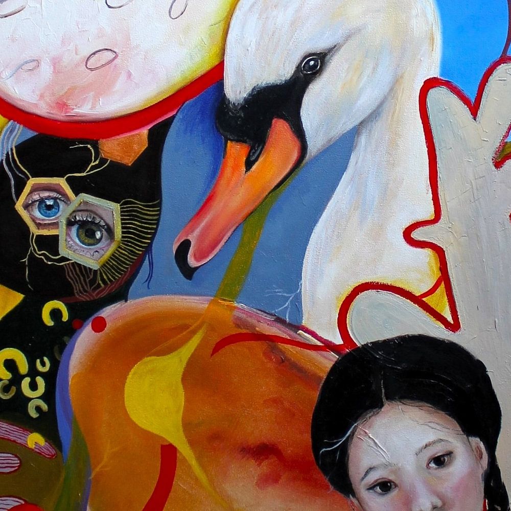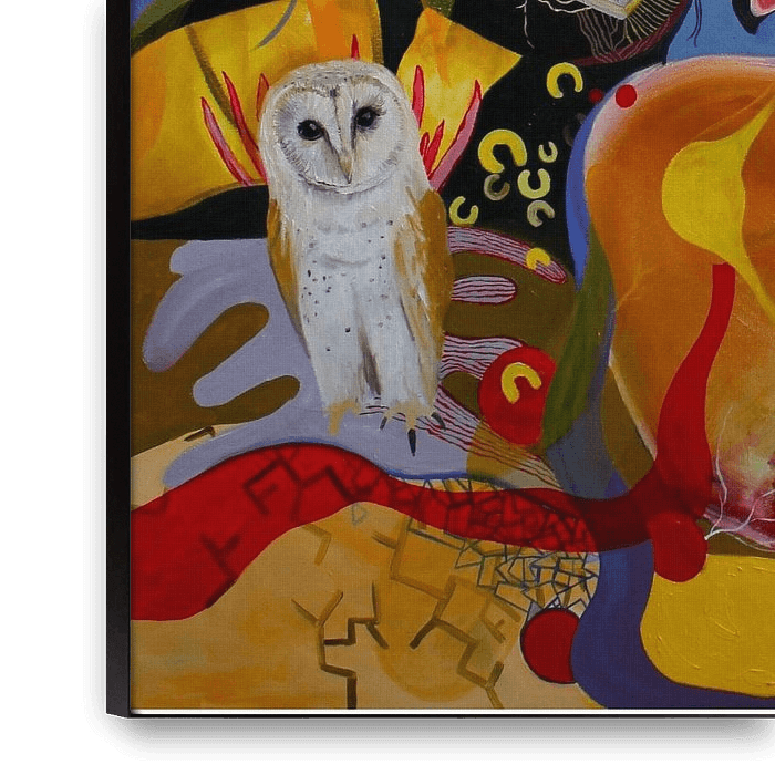 Cette peinture expressive et colorée est une œuvre d'art narrative et puissante créée par l'artiste Nicole Habets. L'œuvre attire immédiatement l'attention et continue d'intriguer par la richesse de ses couches et de son symbolisme. La composition allie figuration et abstraction dans un univers surréaliste où se côtoient humains, animaux et émotions. Les figures centrales telles que le cygne, le hibou et la jeune fille sont porteuses d'une profonde signification symbolique. Le cygne représente la pureté, la transformation et la protection, tandis que le hibou symbolise la sagesse, l'intuition et le subconscient. La jeune fille, avec son regard calme mais pénétrant, est la pièce maîtresse humaine du tableau, représentant la vulnérabilité, la mémoire et l'identité. Les formes et les lignes abstraites qui entourent les personnages suggèrent le mouvement, l'énergie intérieure et la transformation constante. L'utilisation des couleurs est intense et puissante : des bleus vifs, des jaunes chauds, des rouges ardents et des tons de peau doux créent un champ de tension dynamique qui confère à l'œuvre un fort impact visuel. Ces couleurs saturées rendent le tableau particulièrement adapté à une grande toile et garantissent qu'il continue à parler aussi bien de près que de loin. L'œuvre s'intègre parfaitement dans les intérieurs modernes, les salons spacieux, les lieux de travail créatifs et les galeries d'art. Cette œuvre d'art de Nicole Habets est plus qu'une décoration, c'est une expérience émotionnelle et un sujet de conversation. Chaque spectateur découvre de nouveaux détails et de nouvelles couches de signification, de sorte que le tableau ne cesse de surprendre et de s'approfondir. Cette œuvre est idéale pour les amateurs d'art à la recherche d'une peinture unique, expressive et significative, dotée d'une forte signature.