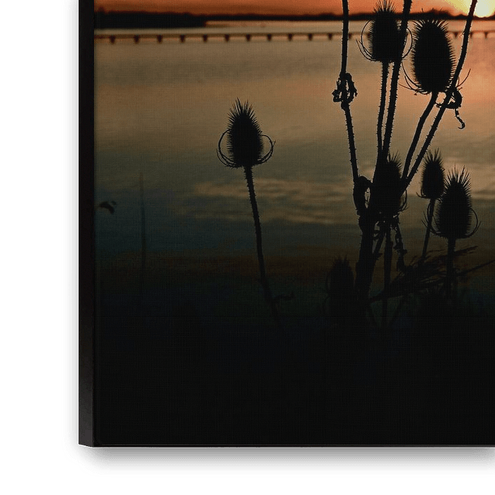 A propos de "Grand teasel au coucher du soleil sur le lac de Dane - debout"