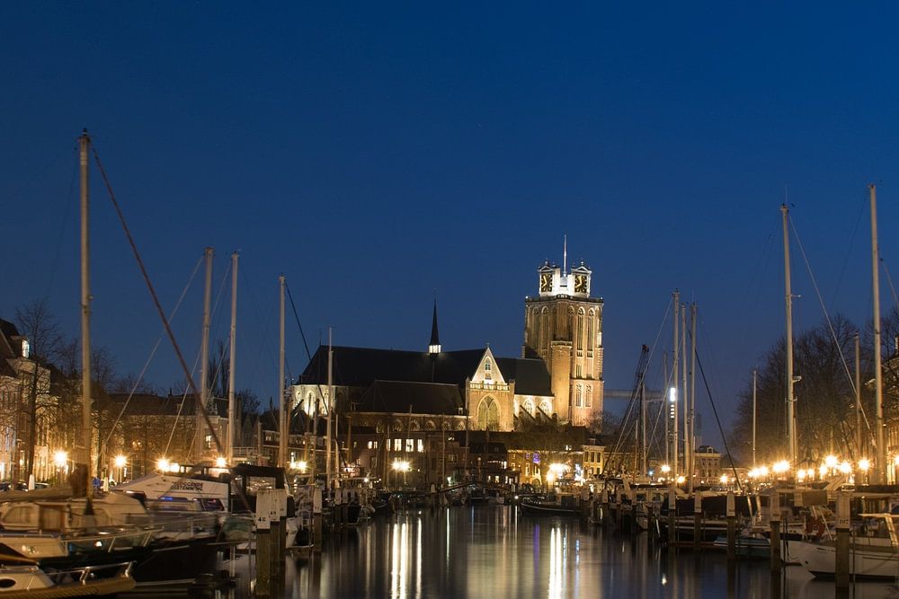 La magnifique Grande église de Dordrecht est une église caractéristique avec une tour penchée remarquable. Sur cette photo, vous pouvez voir l'église au début de la soirée, où toutes les lumières donnent une belle atmosphère. Le ciel bleu clair est vraiment magnifique.