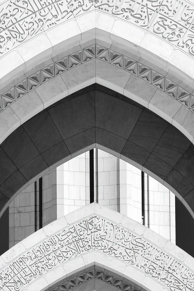 Une arche imposante présente des motifs géométriques et des calligraphies complexes, caractéristiques de l'architecture islamique emblématique. Le contraste saisissant des tons noirs et blancs souligne la conception détaillée et la symétrie de la structure.