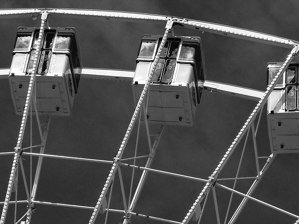 Cette photographie en noir et blanc montre une perspective intime d'une grande roue, capturant un certain nombre de gondoles dans un ciel dramatique. Grâce à une approche minimaliste et à l'utilisation du noir et blanc, je souligne les lignes, les formes et les textures de la grande roue. La structure métallique détaillée contraste fortement avec les nuages doux et menaçants, évoquant un sentiment à la fois de calme et de tension. La répétition symétrique des nacelles crée un motif rythmique qui invite le spectateur à entrer dans le mouvement de la grande roue. Cette photographie capture non seulement une structure mécanique, mais aussi un moment de beauté discrète et d'introspection.
