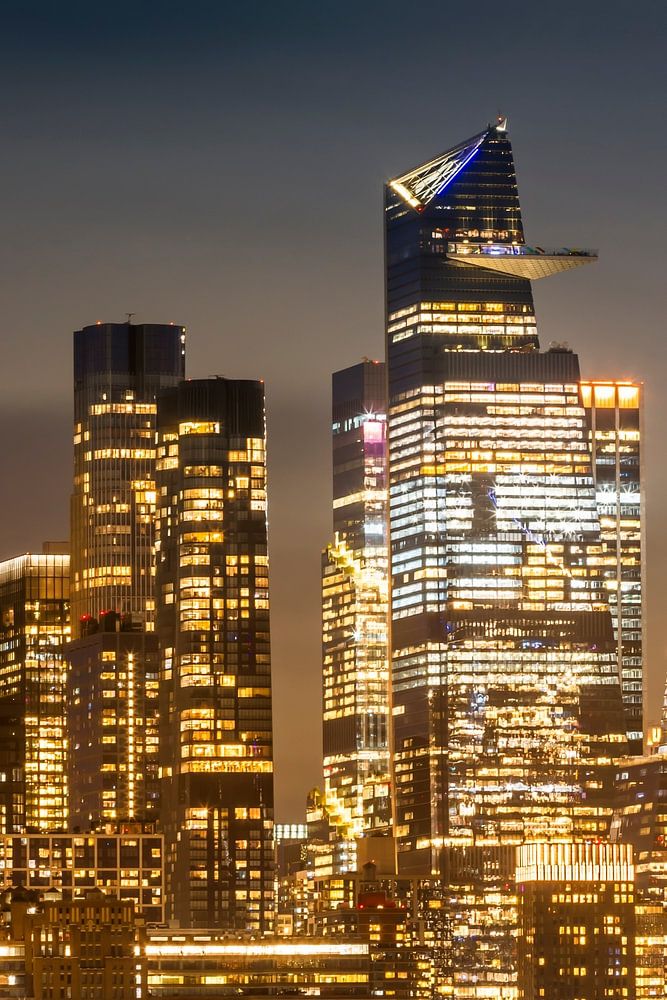 Vue pittoresque de la ligne d'horizon brillante et moderne de Hudson Yards et de Midtown West Manhattan depuis le Waterfront Walkway dans le New Jersey. Au centre de l'image domine l'imposant 30 Hudson Yards, qui attire immédiatement le regard avec son sommet incliné et sa plateforme d'observation "The Edge" qui s'étend loin. Ce bâtiment est l'un des emblèmes les plus connus du nouvel Hudson Yards et incarne l'architecture moderne de Manhattan. À sa droite se trouve le 10 Hudson Yards, un autre bâtiment marquant qui se distingue par sa façade en verre trapézoïdale et ses angles aigus. À gauche du 30 Hudson Yards, on peut voir d'autres bâtiments du quartier, comme le 15 Hudson Yards, qui incarne l'esthétique moderne du quartier avec sa forme élégante et arrondie et sa façade vitrée. Hudson Yards est ici visible dans toute sa splendeur, symbole d'un New York tourné vers l'avenir, où l'architecture moderne et la vie urbaine sont en parfaite harmonie.
