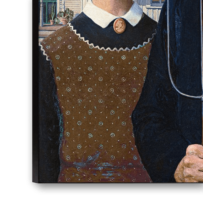 American Gothic est une peinture célèbre créée par l'artiste américain Grant Wood. Achevée en 1930, elle est devenue l'une des œuvres les plus emblématiques et les plus reconnaissables de l'art américain. Le tableau représente un fermier et sa fille devant une ferme de style gothique. Les personnages sont représentés de manière sévère et sérieuse, le fermier tenant une fourche et la fille étant vêtue d'une simple robe. La composition se caractérise par des lignes nettes, des tons sombres et une attention méticuleuse aux détails. Wood a voulu capturer l'essence de l'Amérique rurale, le tableau étant souvent interprété comme l'incarnation du stoïcisme du dur labeur et des valeurs idéalisées du cœur de l'Amérique. L'American Gothic continue de captiver le public par son imagerie évocatrice et son symbolisme durable.