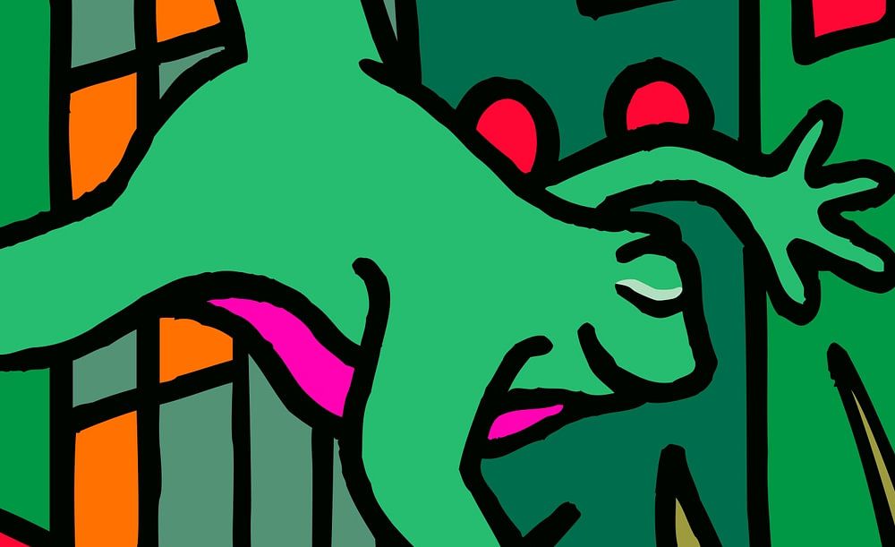 Grenouille gaie sauter à travers la ligne d'horizon de New York la nuit. À l'avant, les lames de gazon naturel.