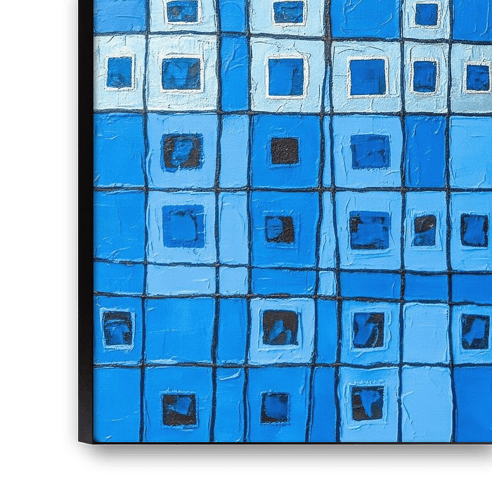 Il s'agit d'une peinture abstraite dominée par différentes nuances de bleu et de noir. La composition est faite d'une grille de surfaces irrégulières, carrées ou rectangulaires, rappelant des pixels ou des carreaux de mosaïque.
