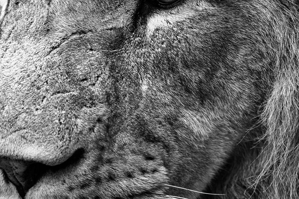A propos de "Gros plan d'un lion en noir et blanc"