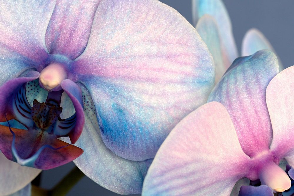 Gros plan d'une orchidée rose lilas sur fond bleu clair