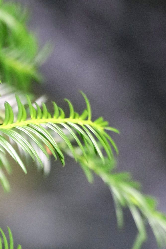 Gros plan d'une branche d'un conifère, avec le murmure de la rivière en arrière-plan qui offre un joli contraste.