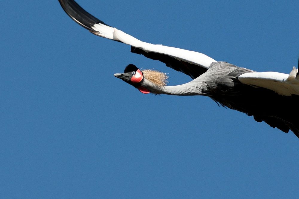 Grue cendrée, Balearica regulorum, oiseau national de l'Ouganda, avec sa couronne de plumes raides et dorées, volant sur fond de ciel bleu.