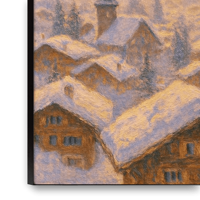 Alors que le crépuscule s'installe sur Gstaad, une brume dorée envahit les toits des villages, transformant la neige en une lueur vivante. La flèche de l'église s'élève doucement parmi les chalets, et la dernière lumière du jour s'attarde comme un souvenir. Cette œuvre d'art incarne la grâce du crépuscule hivernal, où la frontière entre le jour et la nuit devient une conversation de couleurs.