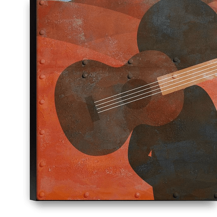Une figure abstraite apparaît dans ce décor : un homme avec un chapeau et une guitare en bandoulière. Il se tient là, icône du rêve et de la musicalité, prêt à suivre son propre chemin et à créer ses propres mélodies. Il symbolise les espoirs de la jeunesse et les désirs d'un avenir meilleur.